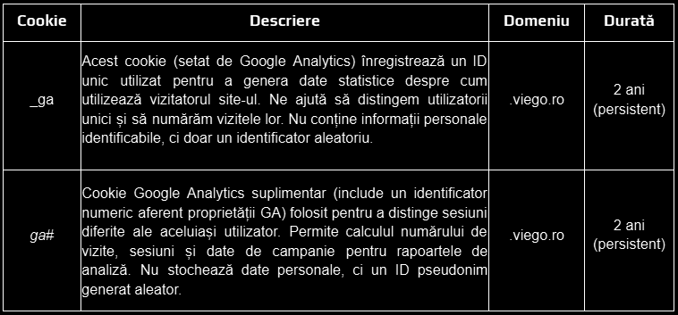 Cookie-uri de analiză și performanță (analytics): Aceste cookie-uri ne ajută să înțelegem cum interacționează vizitatorii cu site-ul, oferindu-ne date anonimizate sau agregate despre zonele vizitate, timpul petrecut pe site, eventuale erori întâmpinate etc.. Scopul lor este de a îmbunătăți performanța și design-ul platformei VieGo, adaptându-ne la nevoile utilizatorilor. Informațiile colectate prin aceste cookie-uri (cum ar fi adresa IP trunchiată, identificatori unici de cookie, pagini vizitate, evenimente in-app) pot identifica indirect un utilizator (prin asociere cu un ID pseudonim al dispozitivului), însă noi nu încercăm să vă identificăm în mod personal prin datele de analytics. Principalii furnizori de cookie-uri analitice pe site-ul nostru sunt terțe părți de încredere, precum Google Analytics. Aceste cookie-uri vor fi plasate doar cu consimțământul dumneavoastră prealabil. La prima vizită pe site, vi se va cere acordul pentru folosirea lor (prin intermediul banner-ului de cookies). Dacă le acceptați, ele ne vor ajuta să culegem statistici ce ne permit să testăm noi funcționalități ori îmbunătățiri (de exemplu, putem testa modificări de design și vedea reacția utilizatorilor la acestea). Dacă refuzați, aceste cookie-uri nu vor fi plasate și vizita dumneavoastră nu va fi urmărită în scop analitic.